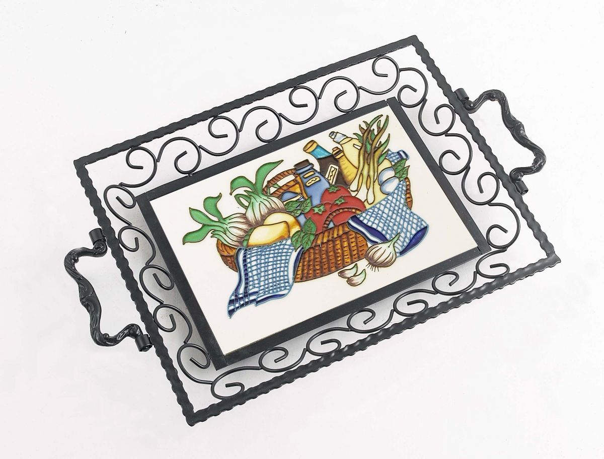 A lovely basket of natures harvest, not forgetting a bottle or two of wine, combine to make a lovely picture basket on this ceramic and cast Iron Garden Tray.
