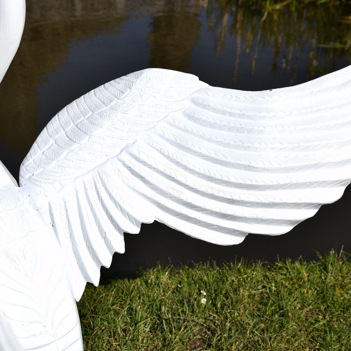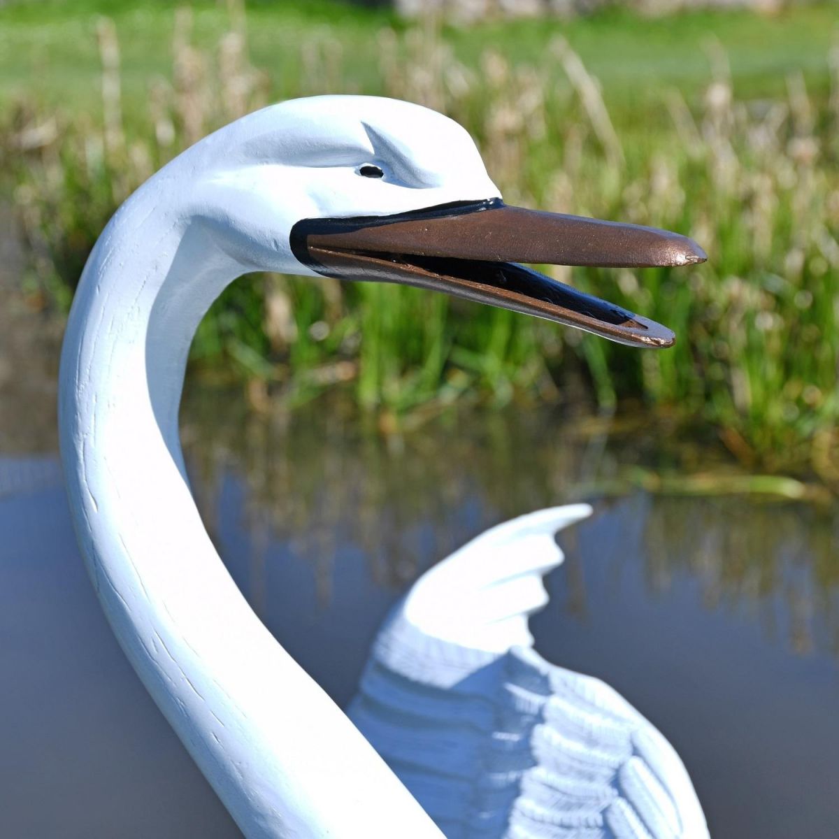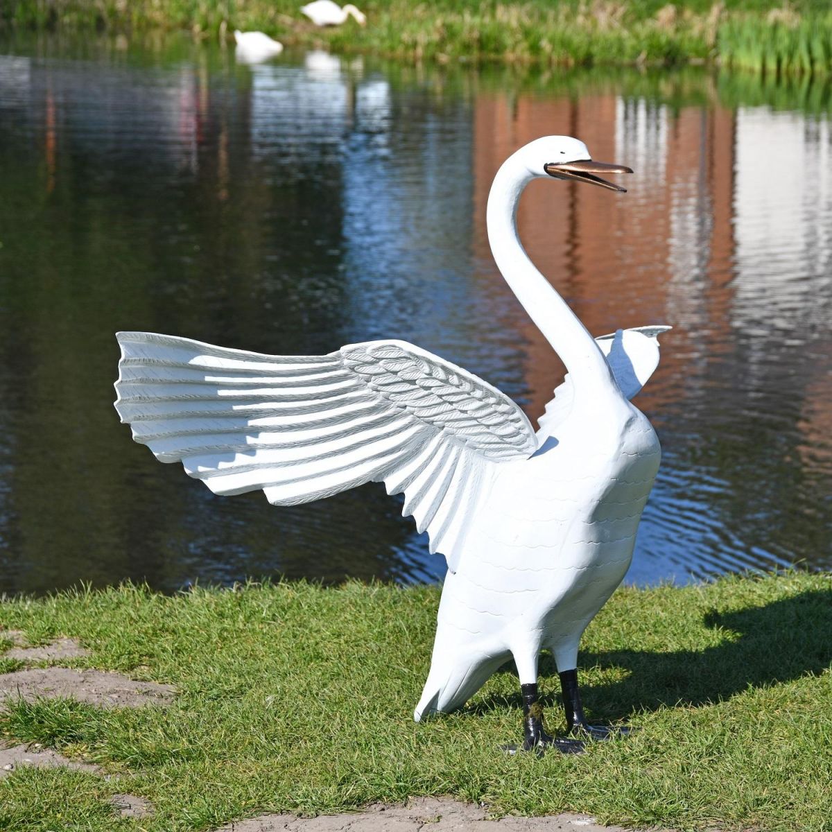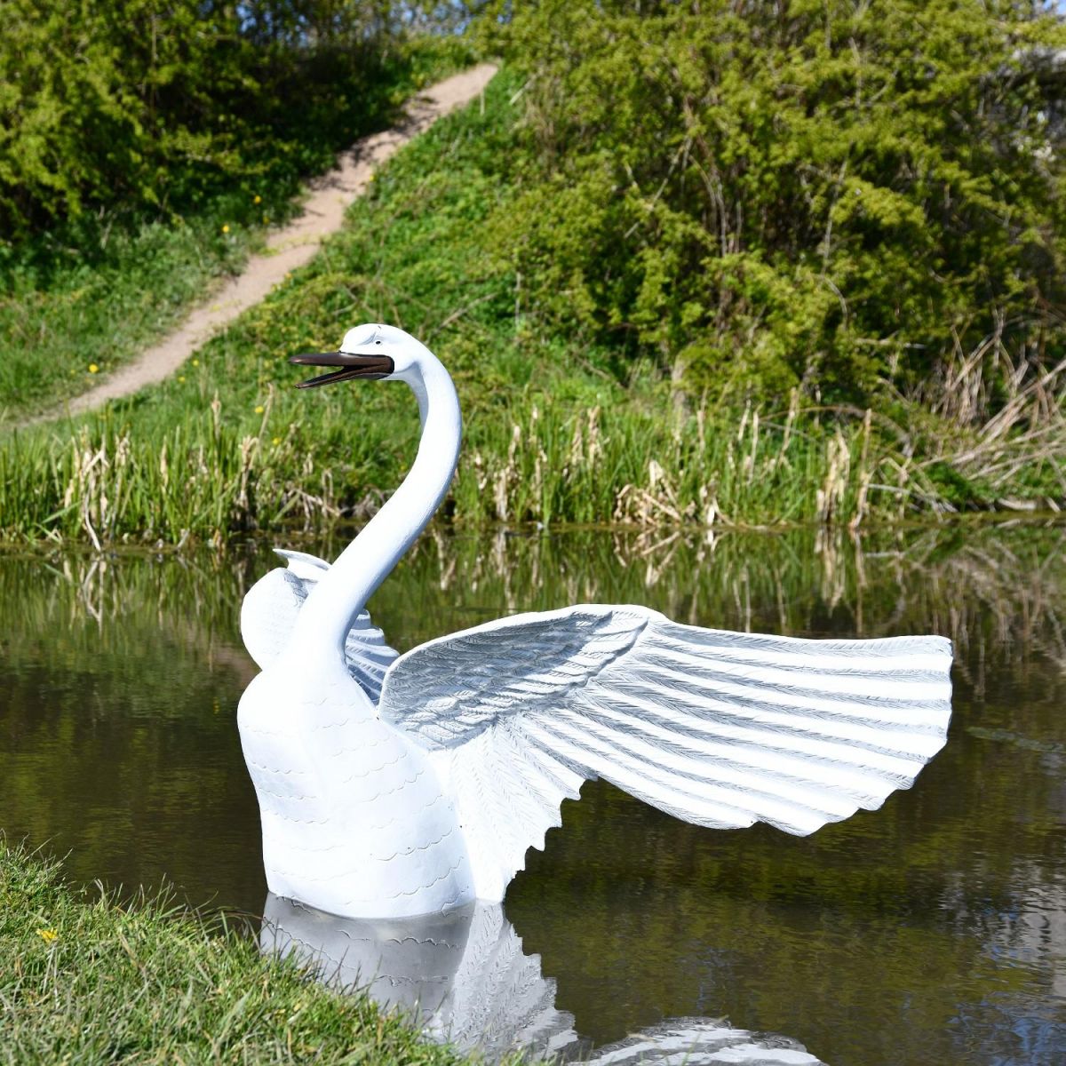 This is no ugly duckling! The most beautiful and regal of flight birds, the Swan is a protected species whereby Queen Elizabeth II owns all living animals and previous royals have done since the 12th Century. Crafted from aluminium and finished in a white finish with orange and black bill detailing, this Swan sculpture is an impressive focal point in any pond, lake or grounds. Stood with wings spread out, as if repositioning itself or just about to take flight, this swan sculpture features delicate detailing throughout the wings which mimic that of the real thing. An exquisite garden sculpture which oozes royalty and charm. This sculpture does have fixing points.