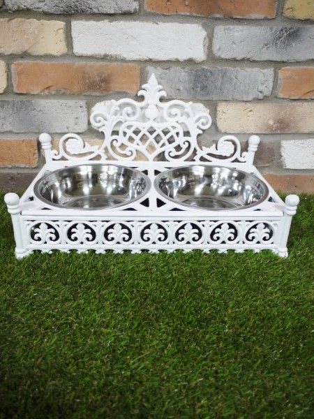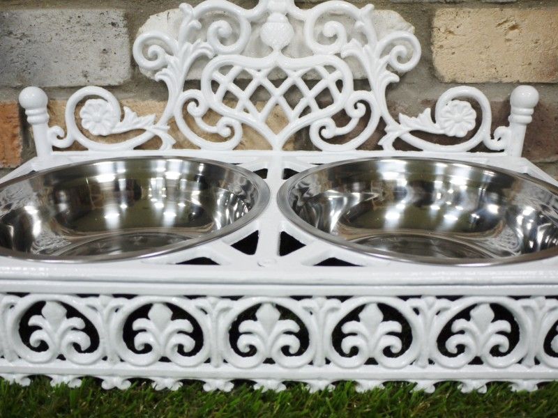 Why should your loyal companion settle for a plastic or ceramic bowl when they could be treated to this stunning cast iron double bowl and holder?