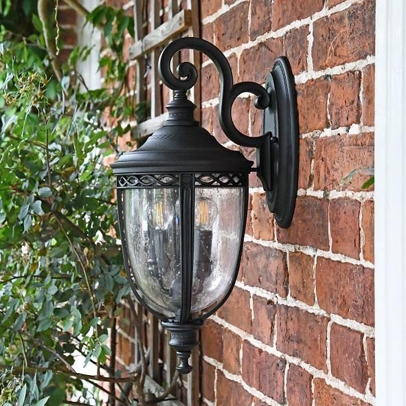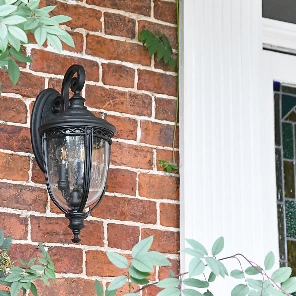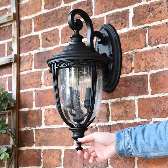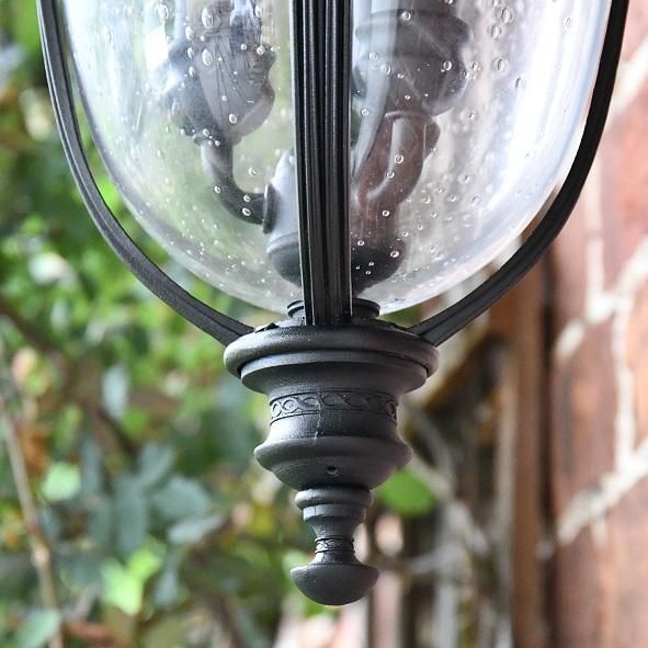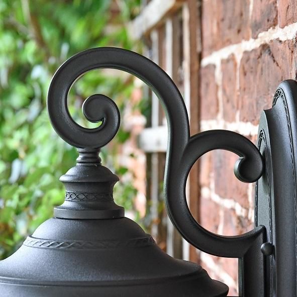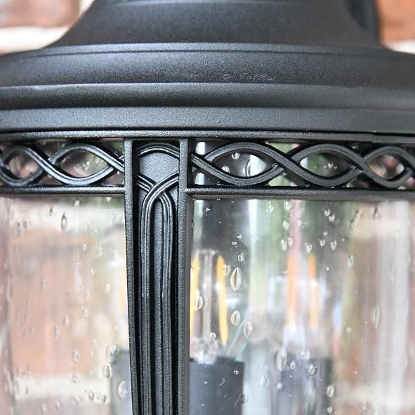 Finished in a sleek midnight black, this Gothic inspired lantern is perfect for any home or property seeking a touch of classic period styling. This lantern comes complete with a scrolled, top-mounted bracket and oval back plate in a matching finish, making this lantern ideal for fitting above a door or porch entryway. Beautifully detailed, this lantern features ornate plaited detailing along its back plate, lid, finials and upper globe frame. This lantern has been fitted with three built-in bulb holders and a textured glass globe for maximum upward and outward light projection.