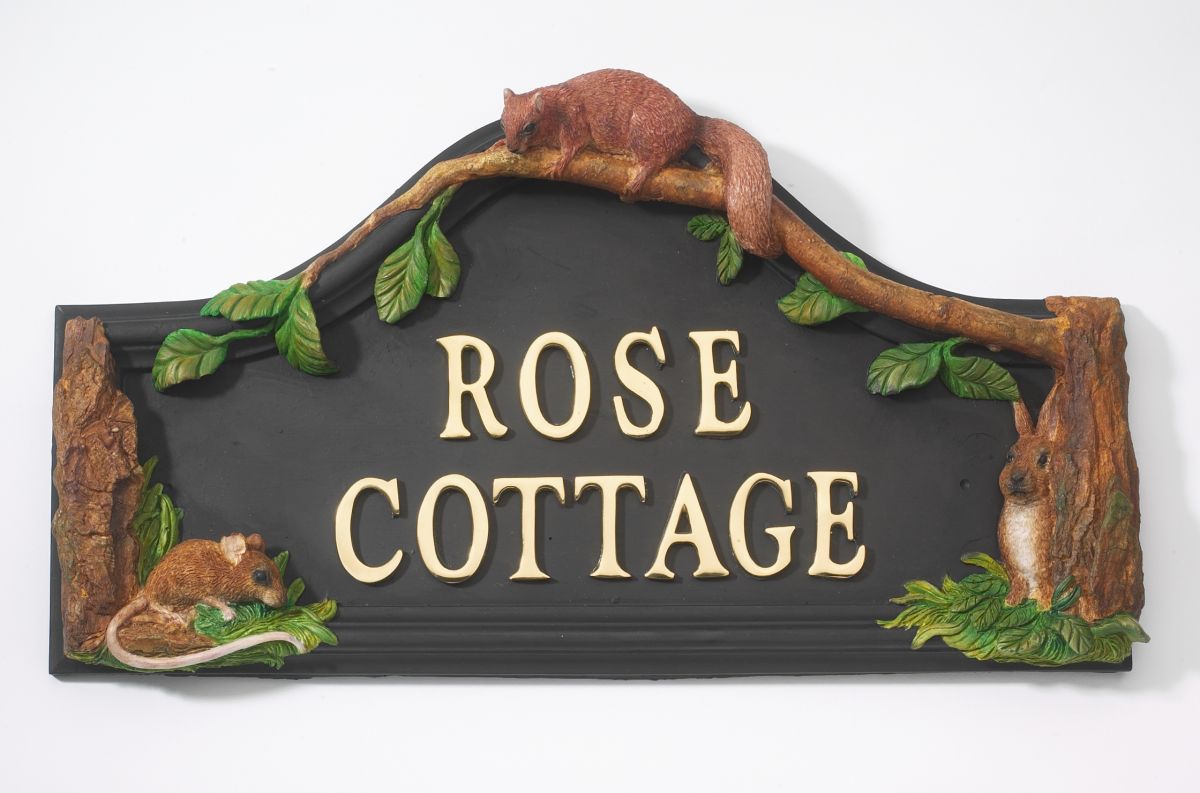 Woodland Hand Painted Double Sided House Name Sign. "Woodland scene" design, double sided house name plaque. These signs are beautifully sculptured and painted by hand. Shown here with polished brass letters - size 406mm (16") wide.
