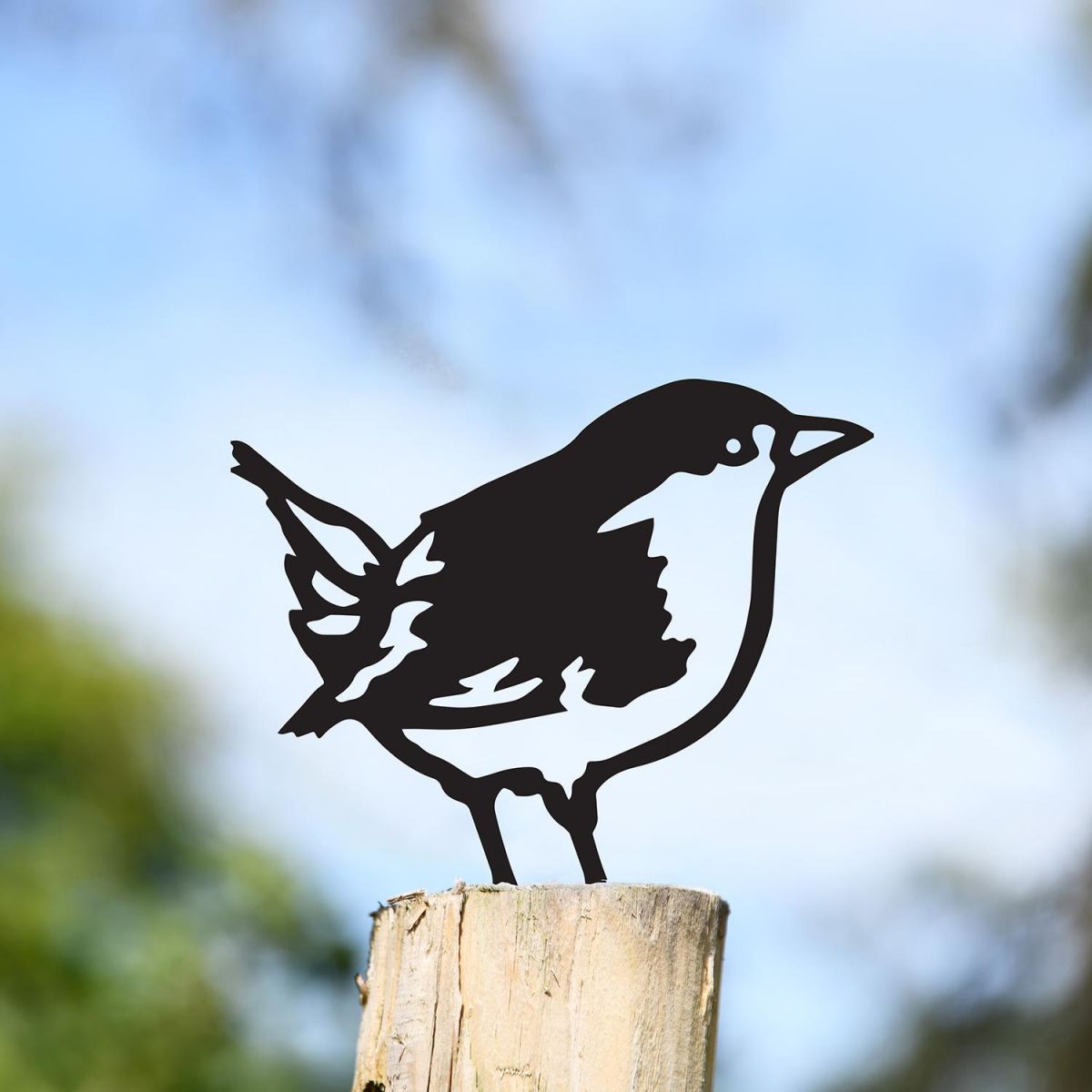 Crafted from high quality robust steel and finished in a sleek midnight black powder coated finish, this fence topper features the silhouette of a wren. A common garden bird, this wren features the iconic short beak and round body, and the cut out designs add character and dimension to the overall piece. Complete with a mounting base with a single pre-drilled hole, it makes for easy installation to any fence or post.