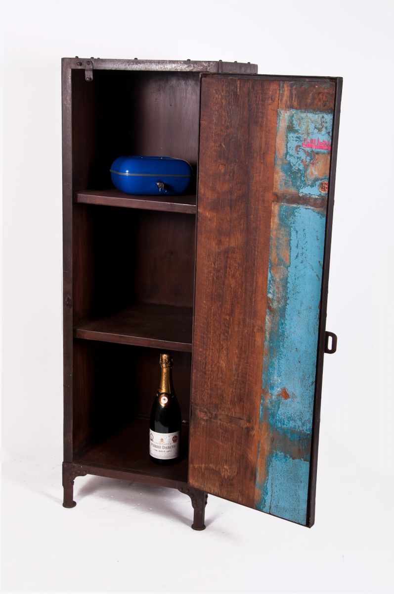 There is also the facility to place a padlock on the door near the large integral handle. Inside there are three deep storage shelves with enough space to place bottles and other taller items, such as folders. The face of the door features antiquated wooden panels in a weathered sky blue.