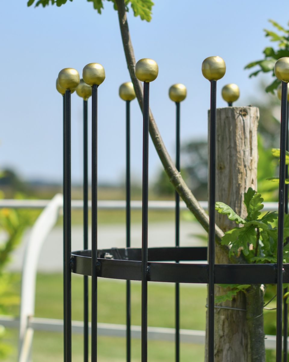 Keep your trees safe and protected throughout all months of the year with this stunning tree guard. Expertly crafted from robust wrought iron, this tree guard has been designed with longevity in mind thanks to its powder coated black finish. Spherical finials crafted from polished brass adorn the top of this tree guard design, making it both stylish and practical. This tree guard comes complete with mesh netting along its base to keep animals such as deer and rabbits away from your growing tree. This tree guard is supplied in two halves for easy installation, and comes complete with integral spiked feet for added stability throughout use.