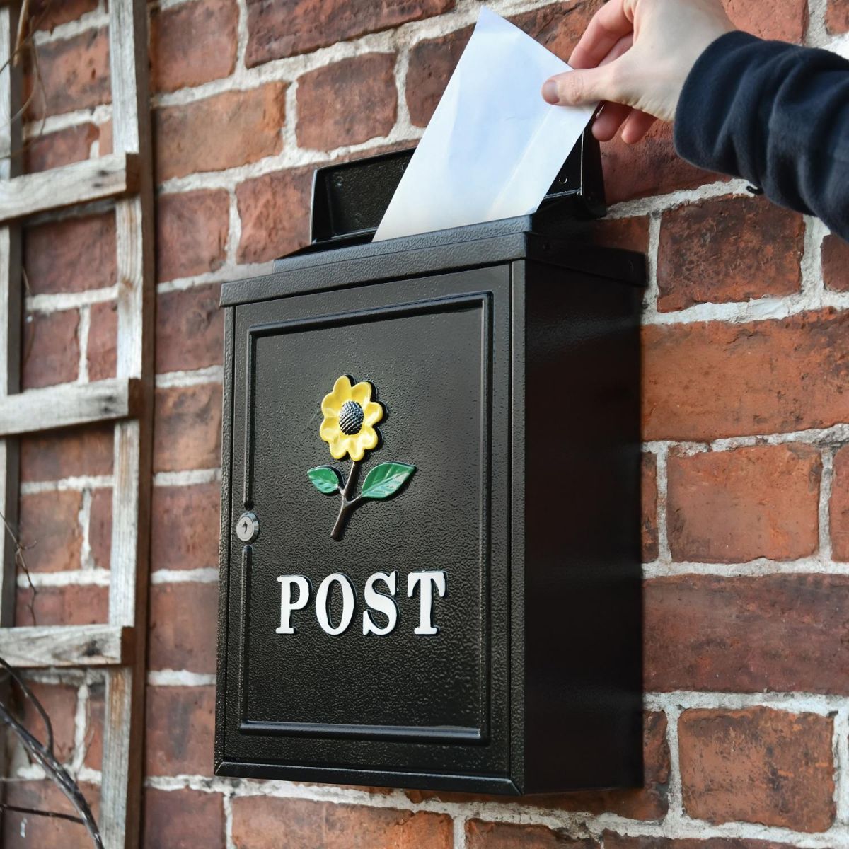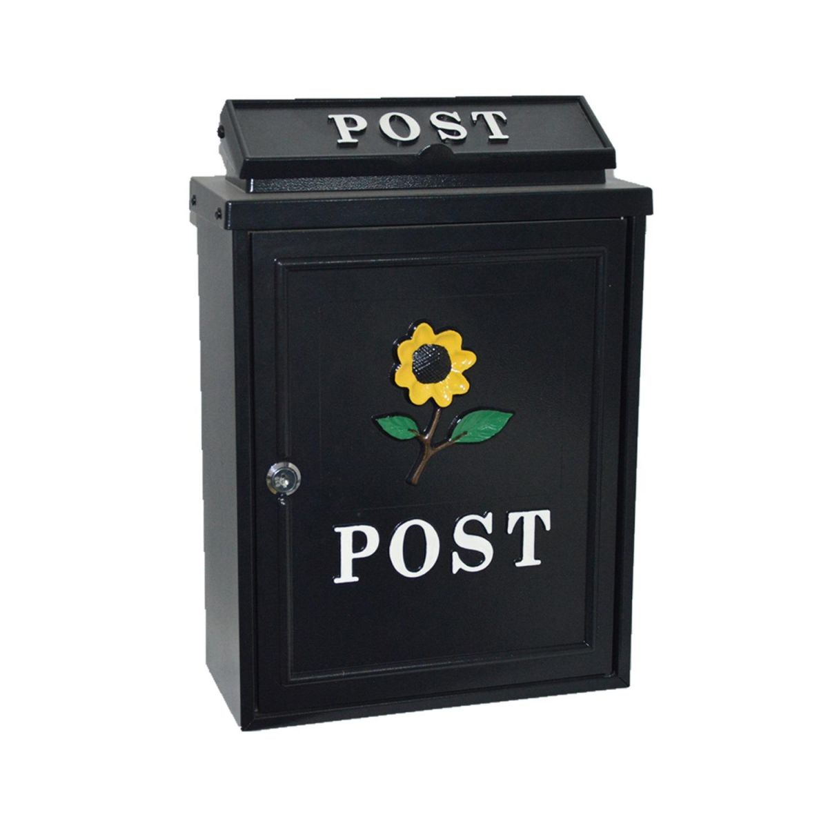 Our Black & Yellow “Oxford" Sunflower Post Box is manufactured by hand using galvanised steel and hand cast aluminium detailing to the door and letter flap. All finished in a black powder coat paint with a yellow and green, hand-painted sunflower motif.